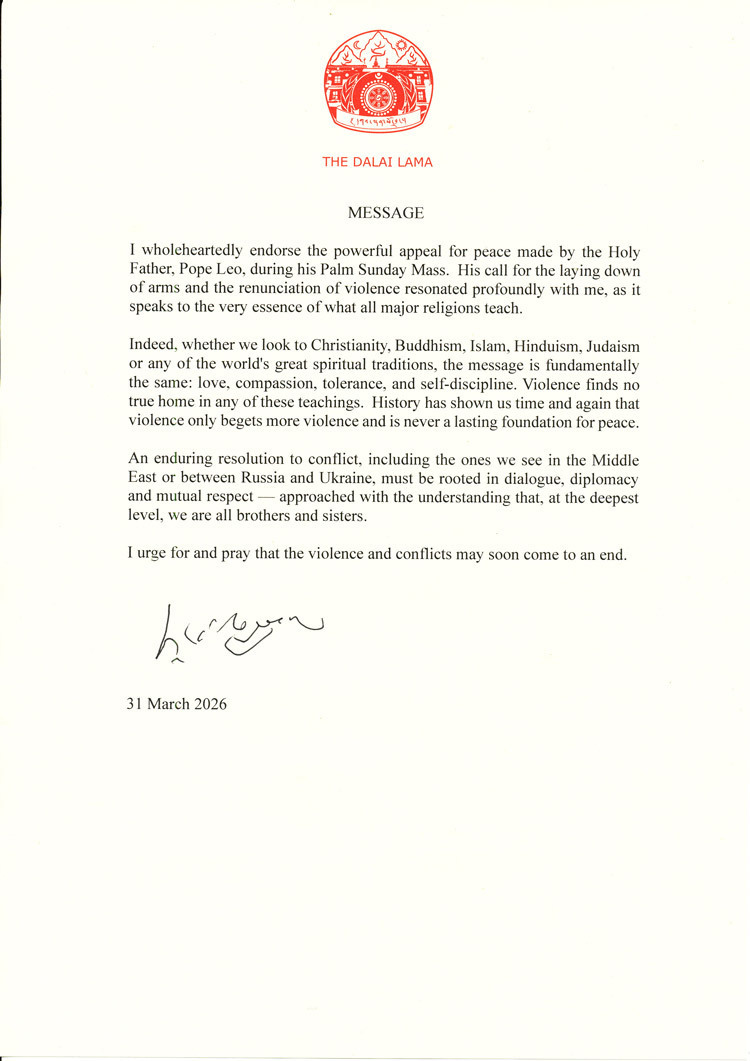 Ich unterstütze aus ganzem Herzen den eindringlichen Friedensappell, den der Heilige Vater, Papst Leo, während seiner Palmsonntagsmesse gerichtet hat. Sein Aufruf, die Waffen niederzulegen und der Gewalt abzuschwören, hat mich tief bewegt, da er den Kern dessen anspricht, was alle großen Religionen lehren.
